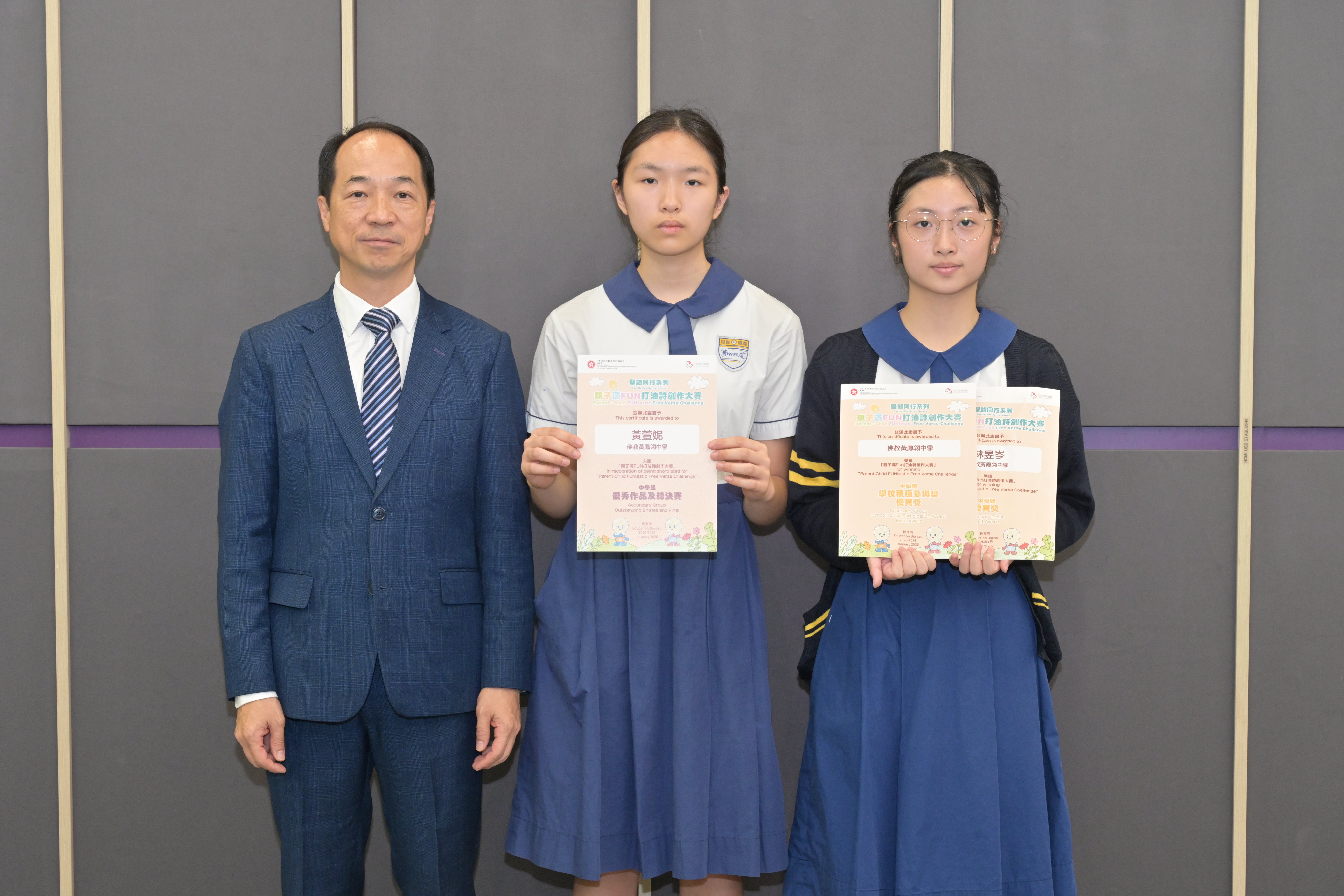 主辦:香港青年交流促進聯會、傑出青年協會、香港學生活動基金會及龍之家社會服務基金 嘉許狀 5A 吳子杰 5D 陳柏曦 5D 陳若萱 5D 錢嘉誠
